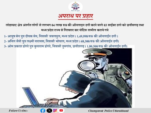 उक्त के क्रम में जनपद चंपावत के थाना लोहाघाट क्षेत्र अंतर्गत अज्ञात साइबर ठगो द्वारा 03 व्यक्ति से 3,98,798/रूपये की ऑनलाइन ठगी की गई थी जिस सम्बन्ध में थाना लोहाघाट में अभियोग 03 अभियोग पंजीकृत कर विवेचना की गयी। दौराने विवेचना उक्त अभियुक्तो का छत्तीसगढ़ तथा मध्य प्रदेश राज्य में होना प्रकाश में आया । ऑनलाइन ठगी के मामलो में प्रकाश में आये अभियुक्त की गिरफ्तारी हेतु जनपद स्तर पर अपर उपनिरीक्षक नरेश कुमार, थाना लोहाघाट के नेतृत्व में टीम का गठन कर अभियुक्तो की गिरफ्तारी हेतु छत्तीसगढ़ तथा मध्य प्रदेश राज्य भेजा गया । पुलिस टीम द्वारा छत्तीसगढ़ तथा मध्य प्रदेश राज्य में जाकर सुरागरसी पतारसी करते हुए ऑनलाईन ठगी करने वाले 03 अभियुक्तो को गिरफ्तार करते हुए नोटिस तामील कराया गया तथा घटना के समय प्रयोग किये गये मोबाईलो को जब्त किया गया।