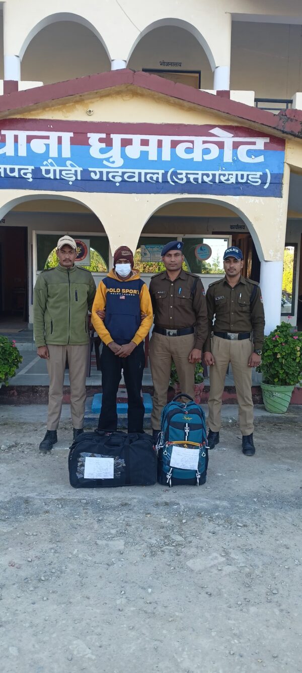 कोटद्वार। वरिष्ठ पुलिस अधीक्षक पौड़ी लोकेश्वर सिंह के निर्देशन में बढते नशे की प्रवृत्ति पर अंकुश लगाने के लिए नशा तस्करों पर लगातार शिकंजा कसा जा रहा है। धुमाकोट पुलिस टीम द्वारा अपने क्षेत्र में चेकिंग के दौरान शंकरपुर चेकपोस्ट पर चेकिंग होते देख एक व्यक्ति अपने सामान के साथ नदी की तरफ वाले रास्ते की ओर जाने लगा। पुलिस टीम को शक होने पर व्यक्ति के बैग की तलाशी ली गई तो दो बैग से 18 किलो 900 ग्राम अवैध गांजा बरामद हुआ। मामले में पुलिस ने पीरुमदारा, थाना रामनगर निवासी राज मल्होत्रा को गिरफ्तार कर लिया। बरामद गांजे की कीमत छह लाख साठ हजार रुपए बताई जा रही है। पुलिस टीम में उप निरीक्षक कमल सिंह रावत, अपर उप निरीक्षक हेमराज पंवार, मुख्य आरक्षी आनंद प्रकाश, आरक्षी शैलेंद्र पेटवाल, वीरेंद्र प्रताप, विपिन कुमार शामिल थे।