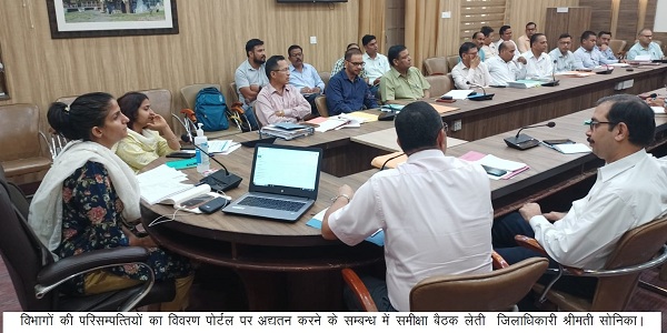 देहरादून : जिलाधिकारी सोनिका ने ऋषिपर्णा सभागार कलेक्ट्रेट में विभिन्न विभागों के जनपद स्तरीय अधिकारियों के साथ बैठक आयोजित करते हुए निर्देश दिए कि सभी विभाग अपनी परिसम्पतियों का विवरण पब्लिक मैनजमैंट पोर्टल पर अपलोड करने के कार्यों में तेजी लाने के निर्देश दिए। साथ ही निर्देशित किया प्रतिदिन अपलोड किए गए कार्यों का विवरण/सूचना कन्ट्रोलरूम को उपलब्ध कराएगें। उन्होंने कहा कि यदि किसी को विवरण अपलोड करने में कोई समस्या आ रही है तो वे जिला सूचना विज्ञान अधिकारी से समन्वय कर शंका का समाधान कर सकते है।