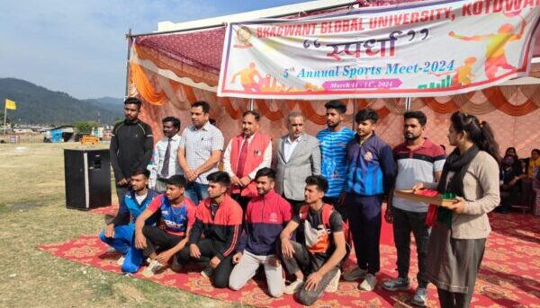 कोटद्वार । भगवंत ग्लोबल विश्वविद्यालय में वार्षिक खेलकूद प्रतियोगिता ‘स्पर्धा’ 2024 का शांति पूर्वक समापन । भाबर स्थित भगवंत ग्लोबल विश्वविद्यालय में तीन दिवसीय वार्षिक खेलकूद सम्मेलन ‘स्पर्धा’ का आज विधिवत समापन हो गया। समापन अवसर पर भगवंत ग्लोबल विश्वविद्यालय के प्रतिकुलपति प्रो. पीएस राणा ने सर्वप्रथम मुख्य अतिथि प्राचार्य राजकीय महाविद्यालय कण्वघाटी कोटद्वार प्रो. वीके अग्रवाल को पुष्प गुच्छ व स्मृति चिन्ह भेंट कर स्वागत किया। प्रो. पीएस राणा ने खेल को जीवन के लिए आवश्यक बताया। उन्होंने कहा कि खेल से जहां एक ओर मनोरंजन होता है वहीं दूसरी ओर शारीरिक के साथ सामाजिक विकास भी होता है। अपने उद्बोधन में मुख्य अतिथि प्राचार्य राजकीय महाविद्यालय कण्वघाटी कोटद्वार प्रो. वीके अग्रवाल ने स्वस्थ रहने हेतु खेल की उपयोगिता बताई।