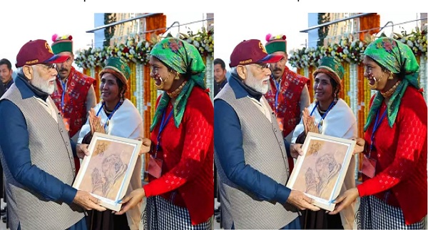 देहरादून। उत्तरकाशी के हर्षिल निवासी अनुप्रिया रावत ने प्रधानमंत्री नरेंद्र मोदी को भोजवासा क्षेत्र के पवित्र भोजपत्र में बनी टकनौरी पेंटिंग भेंट की। प्रधानमंत्री ने पेंटिंग की खूब तारीफ कर अनुप्रिया से ऑर्गेनिक रंगों से बनाई गई पेंटिंग की जानकारी ली। गौरतलब है कि 27 जनवरी को दिल्ली में सीमांत गांव के सरपंचों एवं जनप्रतिनिधियों के सम्मेलन में हर्षिल ग्राम पंचायत के उप प्रधान माधवेंद्र रावत एवं उनकी पत्नी अनुप्रिया रावत ने प्रधानमंत्री नरेंद्र मोदी से मुलाकात कर प्रधानमंत्री को भोजपत्र में बनी खास शैली की टकनौरी पेंटिंग भेंट की। इस कार्यक्रम में देशभर से 1500 पंचायत प्रतिनिधियों ने भाग लिया था। लेकिन प्रधानमंत्री से 10 पंचायत प्रतिनिधियों को मिलने के लिए बुलाया गया।