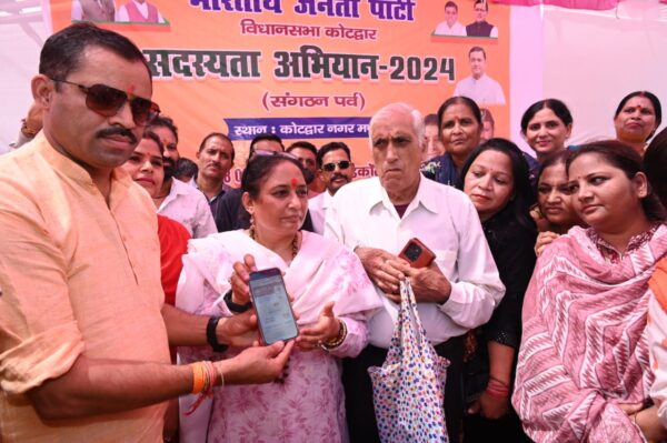 कोटद्वार । विधानसभा अध्यक्ष ऋतु खण्डूडी भूषण ने संगठन पर्व के शुभारम्भ होने पर कोटद्वार झंडाचौक पर स्थित कार्यक्रम में जिलाध्यक्ष भाजपा कोटद्वार बिरेंद्र रावत की अध्यक्षता में भाजपा की सदस्यता ग्रहण की । विधानसभा अध्यक्ष ने बताया कि प्रत्येक क्षेत्र व हर समाज के सभी लोग भारतीय जनता पार्टी की सदस्यता अभियान पर्व को उत्साह के साथ मना रहे है कल भारतीय जनता पार्टी के केंद्रीय कार्यालय में राष्ट्रीय अध्यक्ष जेपी नड्डा द्वारा प्रधानमंत्री नरेंद्र मोदी को सदस्यता का नवनीकरण करवाया, इसी क्रम में मंगलवार से सभी कार्यकर्ता अपनी सदस्यता का नवनीकरण व नये सदस्यों के सदस्यता अभियान में जुट गए है ।