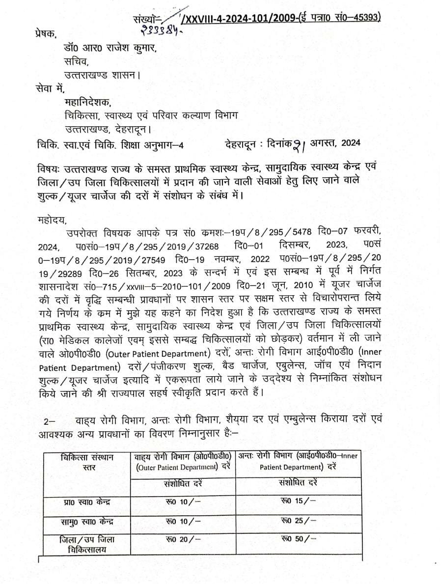 नए शासनादेश के अनुसार जिला अस्पताल और उप जिला अस्पतालों में ओपीड़ी पंजीकरण का शुल्क 28 रुपये के स्थान पर 20 रुपये, प्राथमिक स्वास्थ्य केंद्रों और सामुदायिक स्वास्थ्य केंद्र में 10 रुपये हो गया है। जिला अस्पताल और उप जिला अस्पतालों में आईपीडी पर्ची का शुल्क 145 रुपये के स्थान पर 50 रुपये कर दिया है। प्राथमिक स्वास्थ्य केंद्र में 15 रुपये और सामुदायिक स्वास्थ्य केंद्र में 25 रुपये शुल्क तय किया गया है। इसके साथ ही