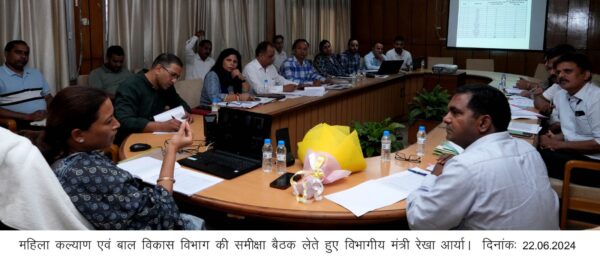 देहरादून : महिला सशक्तिकरण एवं बाल विकास मंत्री रेखा आर्या ने विधान सभा स्थित सभागार कक्ष में विभागीय अधिकारियों के साथ महिला सशक्तिकरण एवं बाल विकास विभाग की समीक्षा बैठक ली।  मंत्री ने पूर्व में दिये गये निर्देशों के पालन के संबंध में विभागीय अधिकारियों के साथ विस्तृत चर्चा की एवं उन्होंने वीडियो कान्फ्रेन्सिंग के माध्यम से सम्मिलित हुए सभी जिला कार्यक्रम अधिकारियों से विभाग द्वारा संचालित योजनाओं की जनपदवार जानकारी प्राप्त की तथा आवश्यक दिशा-निर्देश दिये। मंत्री ने कहा कि महिला कल्याण कोष के लिए आबकारी विभाग के माध्यम से प्राप्त होने वाले अतिरिक्त शुल्क के लिए नियमावली बनाने हेतु निर्देश दिये गये थे जिसका विभाग द्वारा अनुपालन नहीं किया गया है जिस पर विभागीय मंत्री ने सख्त नाराजगी जताते हुए यथाशीघ्र नियमावली बनाने के निर्देश दिये।