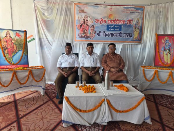 वर्तमान स्थिति पर उन्होंने कहा कि टैरिफ द्वारा भारत को कमजोर करने की कोशिश, षडयन्त्रो द्वारा जातीय संघर्ष, हिन्दुत्व व हिन्दू दर्शन से घृणा, लव जेहाद, लैण्ड जेहाद, जनसंख्या असन्तुलन, पलायन, रोजगार संसाधनो पर कब्जा, कौशल विकास में हिन्दू शिथिलता, ग्राम स्वालम्बन, रीति-रिवाजों परम्पराओं से खिलवाड, समाज तोडनेवाले धारावाहिकों का षडयन्त्र, देशविरोधी गतिविधिया, वामपंथी एजेन्डे को समझना और सर्तकता जैसी समस्याओं से बचाने के लिए संघ के 42 सगठन कार्य कर रहे हैं। जो संघ के उद्देशय भारत माता को परम वैभव पर पहुंचाने को समाज के सहयोग से पूर्ण करेंगे ।संघ प्रार्थना कर कार्यक्रम पूर्ण किया गया जिसमे संघचालक जल सिंह, ललित प्रसाद विभाग सह प्रचारक, जितेन्द्र जिला प्रचारक, मनोज विभाग सह कार्यवाह, त्रिभुवन जिला कार्यवाह, रमेश, सहदेव, सतीश, सुभाष, अंशुल, संजय, संदीप, रवि, रविन्द्र सहित सैकडो गणवेश धारी स्वयंसेवक उपस्थित रहे।