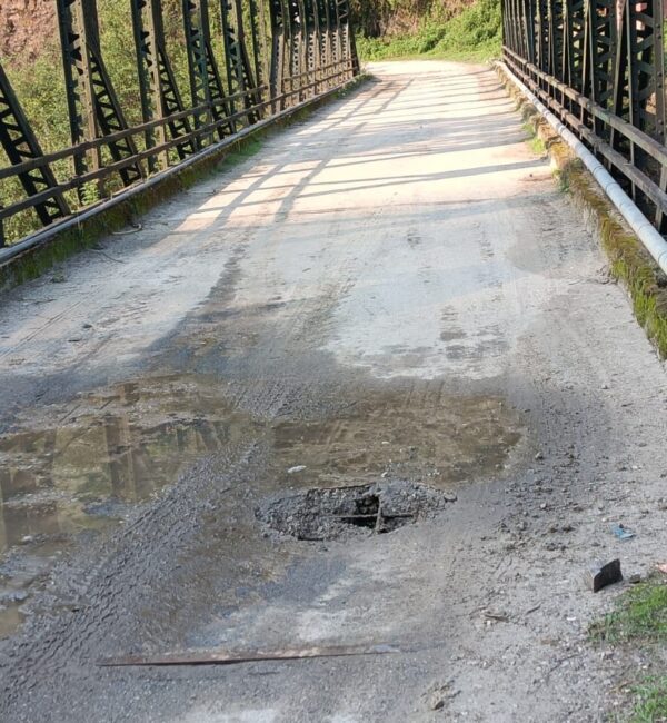 देवाल (चमोली)। चमोली जिले के नंदा देवी राजजात यात्रा का थराली-देवाल-लोहाजंग-वाण मोटर मार्ग के किलोमीटर 18 पर बमणबेरा गधेरे में बना हरिपुर मोटर पुल के उपर बिछा लेंटर उखड जाने के कारण इसमें सरिया के जाल से आरपार दिखने लगा है। यदि समय रहते विभाग ने पुल का ट्रीटमेंट नहीं किया गया तो मोटर पुल में कभी भी काई बडी दुघर्टना होने की आशंका बनी हुई है।