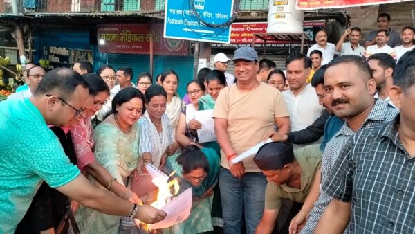गोपेश्वर(चमोली)। राष्ट्रीय पुरानी पेंशन बहाली संयुक्त मोर्चा जनपद चमोली के बैनर तले शिक्षक कर्मचारियों ने गोपेश्वर बस स्टेशन पर एनपीएस शासनादेश की प्रतियों को जलाकर नई पेंशन व्यवस्था के विरोध में काला दिवस मनाया। गोपेश्वर मुख्यालय के बस स्टेशन पर राष्ट्रीय पुरानी पेंशन बहाली संयुक्त मोर्चा जनपद चमोली के बैनर तले देर सांय को शिक्षक , कर्मचारियों ने एकत्रित होकर पुरानी पेंशन बहाली की मांग को लेकर जमकर नारेबाजी कर आक्रोश व्यक्त करते हुए एनपीएस शासनादेश की प्रतियों को जलाकर नई पेंशन व्यवस्था के विरोध में काला दिवस मनाया इस दौरान कर्मचारियों , शिक्षकों ने शीघ्र पुरानी पेंशन बहाली की मांग की है। इस अवसर पर जिलाध्यक्ष पूरण सिंह फस्र्वाण, महासचिव सतीश कुमार, वरिष्ठ उपाध्यक्ष बृजमोहन सिंह रावत , अजीत नेगी, सीमा पुंडीर, रेखा रावत, नीलम रावत, जगत सिंह, नरेंद्र रावत , लक्ष्मी नेगी सहित कई शिक्षक कर्मचारी मौजूद थे।