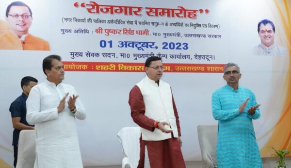 देहरादून : मुख्यमंत्री पुष्कर सिंह धामी ने रविवार को मुख्यमंत्री आवास स्थित मुख्य सेवक सदन में नगर निकायों की पालिका अकेन्द्रीयित सेवा के अंतर्गत उत्तराखण्ड अधीनस्थ सेवा चयन आयोग के माध्यम से चयनित 226 अभ्यर्थियों को नियुक्ति पत्र प्रदान किये। जिन अभ्यर्थियों को नियुक्ति पत्र प्रदान किये गये उनमें नगर निकायों में कर एवं राजस्व मोहर्रिरों/कर संग्रहकर्ता के 148 अभ्यर्थी एवं कनिष्ठ सहायक सह डाटा एन्ट्री ऑपरेटर के 78 अभ्यर्थी शामिल हैं। इस अवसर पर मुख्यमंत्री ने नगर निगम देहरादून द्वारा विकसित किये गये सिटीजन एप ‘वन स्टॉप सोल्यूशन’ भी लांच किया। ओडीएफ प्लस के क्षेत्र में सराहनीय कार्य करने के लिए जनपद हरिद्वार एवं जनपद टिहरी को और स्वच्छता ही सेवा अभियान के तहत सबसे अधिक श्रमदान करने के लिए देहरादून एवं उधमसिंह नगर जनपद को मुख्यमंत्री ने पुरस्कृत किया।