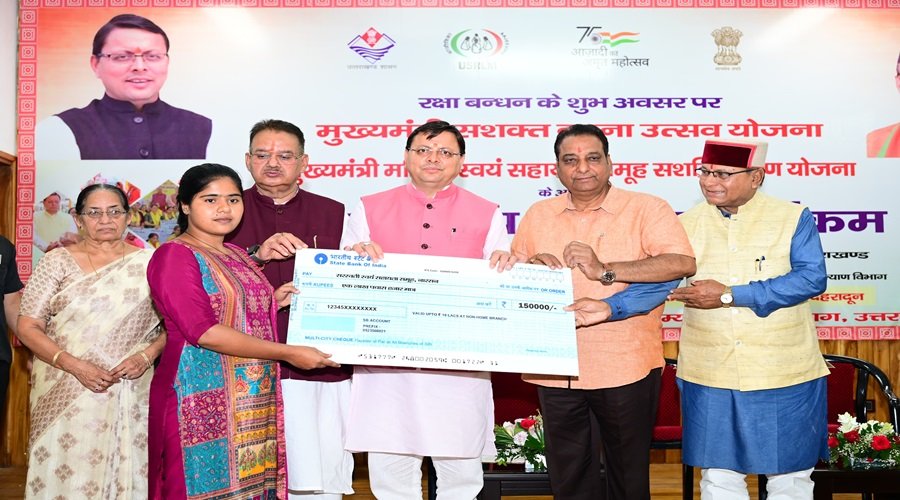 देहरादून : मुख्यमंत्री पुष्कर सिंह धामी ने रक्षाबंधन के उपलक्ष्य में मुख्यमंत्री आवास में ’मुख्यमंत्री सशक्त बहना उत्सव योजना’ और मुख्यमंत्री महिला स्वयं सहायता समूह सशक्तिकरण योजना के अन्तर्गत राज्य स्तरीय कार्यक्रम में प्रतिभाग किया। इस अवसर पर मुख्यमंत्री ने चार जनपदों से आए प्रतिभागियों में से 10 सहायता समूह को रिवॉल्विंग फण्ड के रूप में 25-25 हजार रुपये, 10 समूह को सीआईएफ के रूप में 75-75 हजार रुपये व सीसीएल के रूप 1 लाख 50 हजार रुपये की धनराशि के चेक प्रदान कर उन्हें सम्मानित किया। इस अवसर पर प्रदेश के विभिन्न क्षेत्रों से आई महिलाओं ने मुख्यमंत्री को रक्षा सूत्र बांधा तथा उनके दीर्घायु की कामना की।