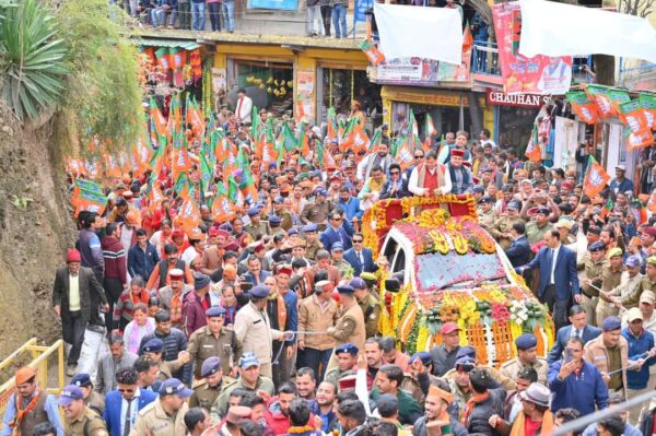 देहरादून : मुख्यमंत्री पुष्कर सिंह धामी ने मंगलवार को बड़कोट, उत्तरकाशी में मुख्य बाजार, बड़कोट से रामलीला मैदान तक आयोजित रोड शो में प्रतिभाग किया। इस दौरान हजारों की संख्या में मौजूद महिलाओं, क्षेत्रीय जनता ने मुख्यमंत्री का पुष्प वर्षा कर स्वागत किया। रंवाई क्षेत्र की जनता के भव्य स्वागत से मुख्यमंत्री अभिभूत नज़र आए। मुख्यमंत्री ने भी लोगों पर पुष्प वर्षा कर उनका अभिनंदन किया। इस अवसर पर भाजपा प्रदेश अध्यक्ष महेंद्र भट्ट, सांसद माला राज्य लक्ष्मी शाह, भाजपा जिला अध्यक्ष सतेंद्र राणा, विधायक दुर्गेश्वर लाल, विधायक सुरेश चौहान, विधायक संजय डोभाल, मीडिया प्रभारी भाजपा मनवीर चौहान एवं अन्य लोग मौजूद रहे।