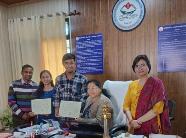 कोटद्वार । राजकीय स्नातकोत्तर महाविद्यालय कोटद्वार के गणित विषय के बीएससी तृतीय वर्ष के छात्र अजय नेगी एवं बीएससी द्वितीय सेमेस्टर की छात्रा आक्षी बिष्ट ने एक सप्ताह 11 से 16 मार्च तक आयोजित होने वाली गणित कार्यशाला 2024 में सफलतापूर्वक प्रतिभाग किया । इसका आयोजन राजकीय स्नातकोत्तर महाविद्यालय उत्तरकाशी व एमटीटीएस ट्रस्ट के तत्वावधान में किया गया । विद्यार्थियों को प्रतिभाग हेतु प्रेरणा व मार्गदर्शन गणित विभाग की प्रभारी डॉ तृप्ति दीक्षित व प्राध्यापक अजय सिंह ने दिया । प्राचार्य प्रोफेसर जानकी पंवार ने गणित विभाग को बधाई दी एवं विद्यार्थियों को उनकी इस सफलता पर उनके उज्ज्वल भविष्य हेतु शुभकामनाएं व आशीर्वाद प्रदान किया। छात्रों की इस उपलब्धि पर गणित विभाग प्रभारी डॉ तृप्ति दीक्षित ने हर्ष व्यक्त कर विद्यार्थियो को बधाई दी एवं अन्य प्रतियोगी परीक्षाओं में प्रतिभाग हेतु प्रेरणा दी ।