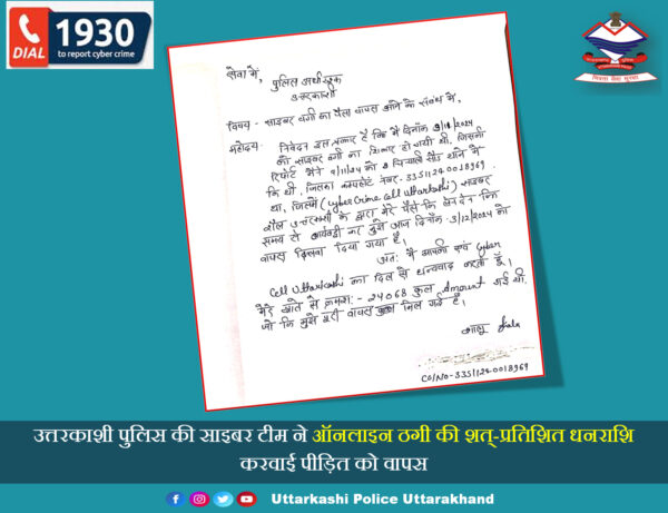 उत्तरकाशी : विगत 9 नवम्बर 2024 को चिन्यालीसौड़ निवासी एक युवती के द्वारा अपने साथ 24,068 रुपये की साइबर धोखाधड़ी होने के सम्बन्ध में ऑनलाइन शिकायत दर्ज की गयी थी।   पुलिस अधीक्षक के दिशा-निर्देशन में उत्तरकाशी पुलिस की साइबर टीम द्वारा उक्त मामले में कार्यवाही करते हुये पीडित से ठगी की गयी शत्-प्रतिशत धनराशि आज  वापस करवायी गयी है। युवती के द्वारा पैंसा वापस मिलने पर उत्तरकाशी पुलिस व साइबर टीम का पत्र लिखकर आभार प्रकट किया गया।