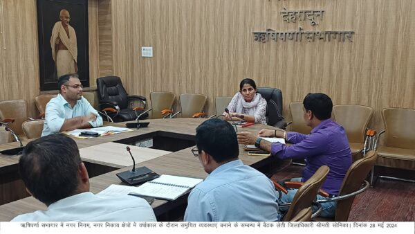 देहरादून : जनपद में वर्षा ऋतु के दृष्टिगत आवश्यक सेवाओं की समुचित व्यवस्था किये जाने के संबंध में जिलाधिकारी सोनिका ने ऋषिपर्णा सभागार में बैठक लेते हुए संबंधित अधिकारियों को आवश्यक दिशा-निर्देेश दिये। जिलाधिकारी ने नगर निगम, नगर निकाय, ग्रामीण क्षेत्रों में वर्षा ऋतु के दौरान जलभराव न हो इसके लिए नगर निगम, नगर निकाय एवं ग्रामीण क्षेत्रों में नदी नालों की सफाई कार्य ससमय कर लिया जाए। उन्होंने ग्रामीण क्षेत्रों में सफाई व्यवस्था हेतु जिला पंचायतीराज अधिकारी को कार्ययोजना प्रस्तुत करने के निर्देश दिये। जिलाधिकारी ने नगर निगम देहरादून एवं ऋषिकेश सहित समस्त नगर निकायों को सिंगलयूज प्लास्टिक के विरूद्ध प्रभावी अभियान चलाने के निर्देश दिये। इस अवसर पर मुख्य नगर आयुक्त नगर निगम गौरव कुमार, अपर जिलाधिकारी वित्त एवं राजस्व रामजीशरण शर्मा, जिला पंचायती राज अधिकारी विद्या सिंह सोमनाल, जिला पंचायत देहरादून से गणेश कुमार भट्ट, सहित नगर निगम देहरादून, नगर निकास विकासनगर, हरर्बटपुर, सेलाकुई, डोईवाला मसूरी के अधिकारी उपस्थित रहे।