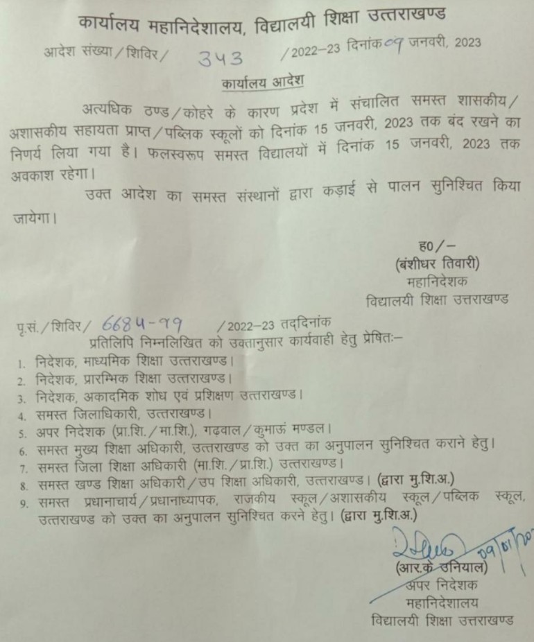 उत्तराखंड महानिदेशालय विद्यालय शिक्षा द्वारा अत्यधिक ठंड तथा कोहरे के कारण शासकीय तथा अशासकीय सहायता प्राप्त स्कूलों को 15 जनवरी तक का अवकाश घोषित किया गया ह
