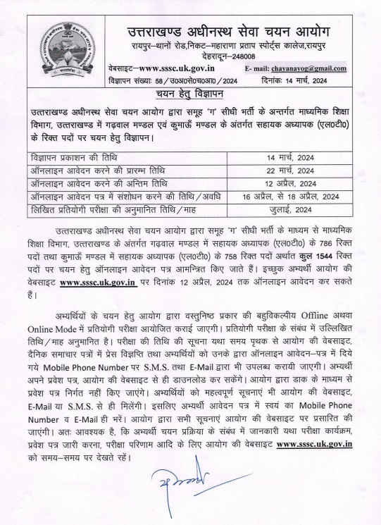 उत्तराखण्ड अधीनस्थ सेवा चयन आयोग द्वारा समूह ‘ग’ सीधी भर्ती के माध्यम से माध्यमिक शिक्षा विभाग, उत्तराखण्ड के अंतर्गत गढ़वाल मण्डल में सहायक अध्यापक (LT) के 786 रिक्त पदों तथा कुमाऊँ मण्डल में सहायक अध्यापक (LT) के 758 रिक्त पदों अर्थात कुल 1544 रिक्त पदों पर चयन हेतु ऑनलाइन आवेदन पत्र आमन्त्रित किए जाते हैं। इच्छुक अभ्यर्थी आयोग की वेबसाइट www.sssc.uk.gov.in पर दिनांक 12 अप्रैल, 2024 तक ऑनलाइन आवेदन कर सकते हैं।