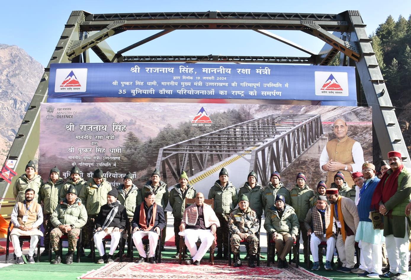 गोपेश्वर (चमोली)। रक्षा मंत्री राजनाथ सिंह ने शुक्रवार को सीमांत क्षेत्र जोशीमठ ढाक से बीआरओ की ओर से निर्मित 35 इंफ्रास्ट्रक्चर परियोजनाओं का उद्घाटन करते हुए देश को समर्पित किया। इसमें सात राज्यों की छह सड़कें और 29 ब्रिज शामिल है। परियोजनाओं को बीआरओ की ओर से 670 करोड़ की लागत पर पूरा किया गया। इस दौरान प्रदेश के मुख्यमंत्री पुष्कर सिंह धामी और गढवाल सांसद तीरथ सिंह रावत रक्षामंत्री के साथ मौजूद रहे।