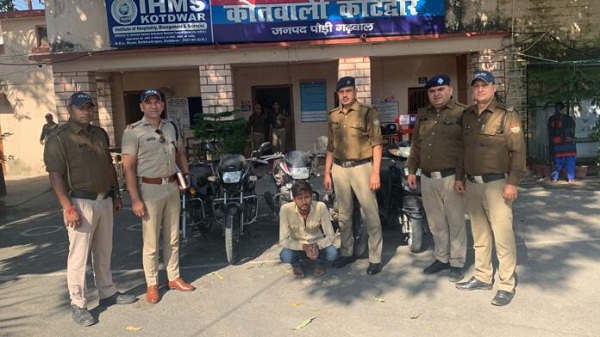कोटद्वार : कोतवाली पुलिस ने आज बाइक चोरी का खुलासा किया है। पुलिस के अनुसार भास्करानन्द खंतवाल निवासी पदमपुर, अमित निवासी शिवराजपुर, उमेश चन्द्र बमोला निवासी विकासनगर गाड़ीघाट और दुर्गाप्रसाद निवासी ग्रास्टनगंज कोटद्वार ने अलग अलग स्थानों पर किसी अज्ञात व्यक्ति के द्वारा उनकी बाइक और स्कूटी चोरी करने के मामले में मुकदमा दर्ज कराया। एसएसपी स्वेता चौबे के निर्देश पर पुलिस मामले की जांच के जुट गई, जिसके बाद पुलिस ने कल रितिश कर्णवाल उर्फ शानू निवासी आदर्श नगर जिला बिजनौर को गूलर पुल कोटद्वार के पास से वाहन संख्या UK12D 5993 (सुपर स्पलैण्डर) के साथ गिरफ्तार किया गया। पुलिस टीम द्वारा पूछताछ कर अभियुक्त की निशानदेही पर तीन अन्य मोटर साईकिल व एक स्कूटी को गूलर पुल के पास से बरामद किया गया। अभियुक्त को गिरफ्तार कर न्यायालय में पेश किया गया।