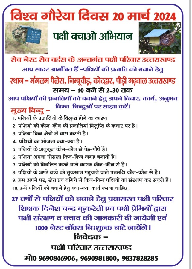 कोटद्वार। गौरेया संरक्षण के क्षेत्र में कार्य कर रहे पक्षी परिवार की ओर से 20 मार्च को विश्व गौरेया दिवस पर कार्यक्रम का आयोजन किया जायेगा। पक्षी प्रेमी शिक्षक दिनेश कुकरेती ने जानकारी देते हुए बताया कि विश्व गौरैया दिवस पर निंबूचौड़ स्थित एक बारातघर के सभागार में कार्यक्रम आयोजित किया जाएगा । जिसमें वर्तमान में गौरैया की प्रजातियों के विलुप्त होने के कारणों सहित पक्षी को संरक्षित करने के उपायों पर चर्चा की जायेगी।