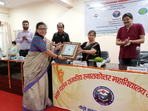 वहीँ डॉ0 चिरंजीत माँजी क़्वाटम यूनिवर्सिटी रुड़की ने ध्वनि के वेग निकलने के विधि के बारे मे बताया, डॉ प्रतीक शर्मा, रानीखेत ने आईन्सटीन के सापेक्षिता सिद्धांत के बारे प्रकाश डाला । सेमिनार के दूसरे तकनीकी सत्र की आयोजक डॉ विनीता देवी रही जिसकी अध्यक्षता प्रो पीयूष सिन्हा ने की । प्रथम व्याख्यान में डॉ रश्मि उनियाल बड़कोट ने ब्लैक होल के भौतिक महत्व पर विस्तृत चर्चा की । डॉ गरिमा पुनेथा, पिथौरागढ़ ने क्वांटम क्रोमो डायनामिक्स के मूलभूत सिद्धांत पर प्रकाश डाला । डॉ महिमा गुरुकुल कागड़ी हरिद्वार एवं डॉ हेमलता व सौम्या ने पोस्टर के माध्यम से विभिन्न आयामों को दर्शया गया । सेमिनार में उत्कृष्ट प्रस्तुति हेतु डॉ गौरव उपाध्याय, डाॅ हेमलता बिष्ट, डॉ इलियास, डॉ हेमलता एवं भास्कर को बेस्ट प्रेजेंटेशन अवॉर्ड दिया गया । कार्यक्रम के समापन समारोह की अध्यक्षता करते हुए, प्राचार्य प्रो एलआर राजवंशी ने कांफ्रेंस में प्रतिभाग करने वाले समस्त शोध छात्रों, वैज्ञानिकों एवं प्राध्यापकों को शुभकामनाएं प्रेषित की एवं कहा कि आयोजित कांफ्रेंस निश्चित रूप से विज्ञान के सैद्धांतिक एवं प्रायोगिक पहलुओं को विस्तार से समझने में उपयोगी सिद्ध होगी । समापन समारोह में प्रो अरुण सिंह रावत, प्रो सीमा रावत, प्रो संजय कुमार एवं प्रो एसपी मधवाल विशिष्ट अतिथि के रूप में उपस्थित रहे।