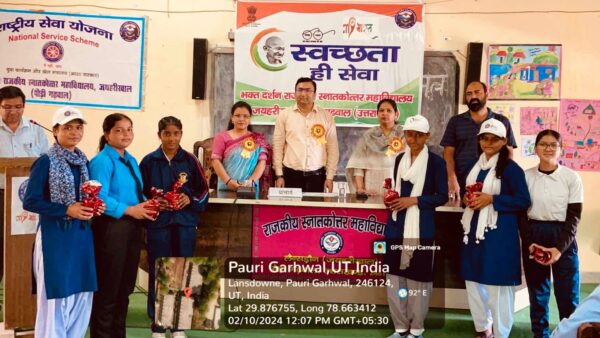 तदोपरांत कार्यक्रम अधिकारी डॉ.अर्चना नौटियाल द्वारा स्वच्छता पखवाड़े के उद्देश्य तथा आयोजित सभी गतिविधियों की आख्या प्रस्तुत की गयी | मुख्य अतिथि द्वारा महाविद्यालय में मनाये गए स्वच्छता गतिविधियों की सरहना की तथा स्वच्छता के महत्व तथा सामूदायिक सहभागिता पर बल दिया | कार्यक्रम के अन्त में प्रभारी प्राचार्य आर.के. द्विवेदी द्वारा राष्ट्रीय सेवा योजना द्वारा चलाये गए इस अभियान की प्रशंसा की गयी एवं मुख्य अतिथि का धन्यवाद किया गया | कार्यक्रम का संचालन डॉ.उमेश ध्यानी द्वारा किया गया | इस अवसर पर सभी प्राध्यापक एवं कर्मचारी उपस्थित रहे |