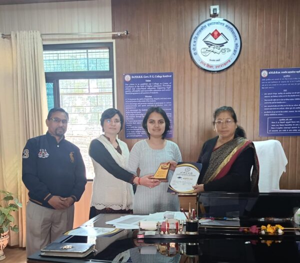 कोटद्वार । राजकीय स्नातकोत्तर महाविद्यालय कोटद्वार में गणित विभागीय परिषद के अंतर्गत आयोजित कविता पाठ एवं वाद विवाद प्रतियोगिता के विजेता प्रतिभागियों को प्प्राचार्य प्रोफेसर जानकी पंवार ने प्रशस्ति पत्र व स्मृति चिन्ह पुरस्कार स्वरूप प्रदान किए साथ ही उन्होंने विद्यार्थियों को जीवन में सफलता हेतु आशीर्वाद एवं शुभकामनाएं दीं।