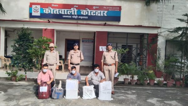 कोटद्वार। वरिष्ठ पुलिस अधीक्षक  पौड़ी लोकेश्वर सिंह के निर्देशन में आगामी पंचायती चुनाव के दृष्टिगत नशे की प्रवृत्ति पर अंकुश लगाने एवं नशा तस्करी की रोकथाम के लिए पौड़ी पुलिस द्वारा नशा तस्करों पर लगातार शिकंजा कसा जा रहा है। प्रभारी निरीक्षक कोटद्वार के निर्देशन में कोतवाली कोटद्वार पुलिस टीम द्वारा चेकिंग के दौरान तीन व्यक्तियों झूलापुल गाड़ीघाट निवासी मोनू गुप्ता उर्फ गौरव गुप्ता, काशीरामपुर तल्ला निवासी आशीष शर्मा व खूनीबड़ निवासी जितेन्द्र सिंह के कब्जे से क्रमशः 24 बोतल अंग्रेजी शराब, 36 बोतल अंग्रेजी शराब व 56 बोतल चण्डीगढ़ मार्का अवैध शराब, कुल- 9 पेटी 8 बोतल बरामद की गई।  पुलिस टीम द्वारा तीनों अभियुक्त को मौके पर गिरफ्तार कर बरामद माल को सील किया गया।