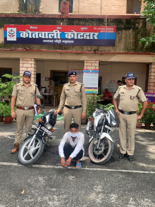 वरिष्ठ पुलिस अधीक्षक पौड़ी लोकेश्वर सिंह द्वारा वाहन चोरी की उक्त घटनाओं को गम्भीरता से लेते हुए अभियोग के सफल अनावरण कर अभियुक्त की शीघ्र गिरफ्तार करने के लिए टीम गठित करने हेतु आदेशित किया गया। जिसके क्रम में प्रभारी निरीक्षक कोटद्वार मणिभूषण श्रीवास्तव के नेतृत्व में पुलिस टीम का गठन किया गया। गठित पुलिस टीम द्वारा सुरागरसी पतारसी व सीसीटीवी कैमरों के आधार पर उक्त अभियोग में संलिप्त अभियुक्त अकिलेन्द्र उर्फ बाबू, उम्र 20 वर्ष, पुत्र महेन्द्र सिंह, निवासी- ग्राम- नेकपुर, पोस्ट- सिकन्दरपुर बलीथान रायपुर, जिला बिजनौर उ0प्र0 को चोरी की गयी मोटरसाइकिल के साथ दिल्ली फार्म रोड फाटक के पास से बरामद कर गिरफ्तार किया गया व दूसरी चोरी की गई मोटरसाइकिल को भी अभियुक्त के कब्जे से बरामद किया गया ।गिरफ्तारशुदा अभियुक्त को माननीय न्यायालय के समक्ष पेशकर आवश्यक वैधानिक कार्यवाही की जा रही है।