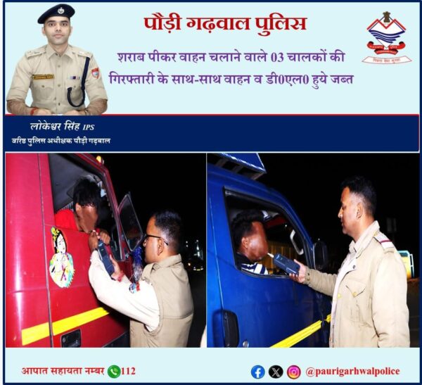 कोटद्वार । वरिष्ठ पुलिस अधीक्षक पौड़ी लोकेश्वर सिंह ने जनपद में सड़क दुर्घटनाओं पर प्रभावी अंकुश लगाने हेतु समस्त थाना प्रभारियों को अपने-अपने थाना क्षेत्र में शराब पीकर वाहन चलाने वालों के खिलाफ कड़ी कार्यवाही करने के निर्देश पर समस्त थाना प्रभारियों द्वारा सांय से लेकर रात्रि तक एल्कोमीटर के साथ सघन चैकिंग अभियान चलाया जा रहा है। चैकिंग के दौरान कोतवाली श्रीनगर ने 1, कोतवाली लैन्सडाउन ने 2 वाहन चालकों को जो शराब पीकर वाहन चला रहे थे के विरूद्ध मोटर वाहन अधिनियम की धारा 185 के तहत कार्यवाही कर चालकों की गिरफ्तारी के साथ-साथ वाहनों को सीज कर चालकों के डीएल निरस्तीकरण की कार्यवाही की गई। जनपद पुलिस ने विगत 25 दिनों में अब तक शराब पीकर वाहन चलाने वाले 59 वाहन चालकों को गिरफ्तार कर उनके वाहनों को सीज किया गया है। साथ ही वाहन चालकों के ड्राइविंग लाइसेन्स निरस्तीकरण की कार्यवाही भी की गई है। जनपद पुलिस की शराब पीकर वाहन चलाने वालों और यातायात के नियमों का उल्लंघन करने वालों के विरूद्ध कड़ी कार्यवाही लगातार जारी है।