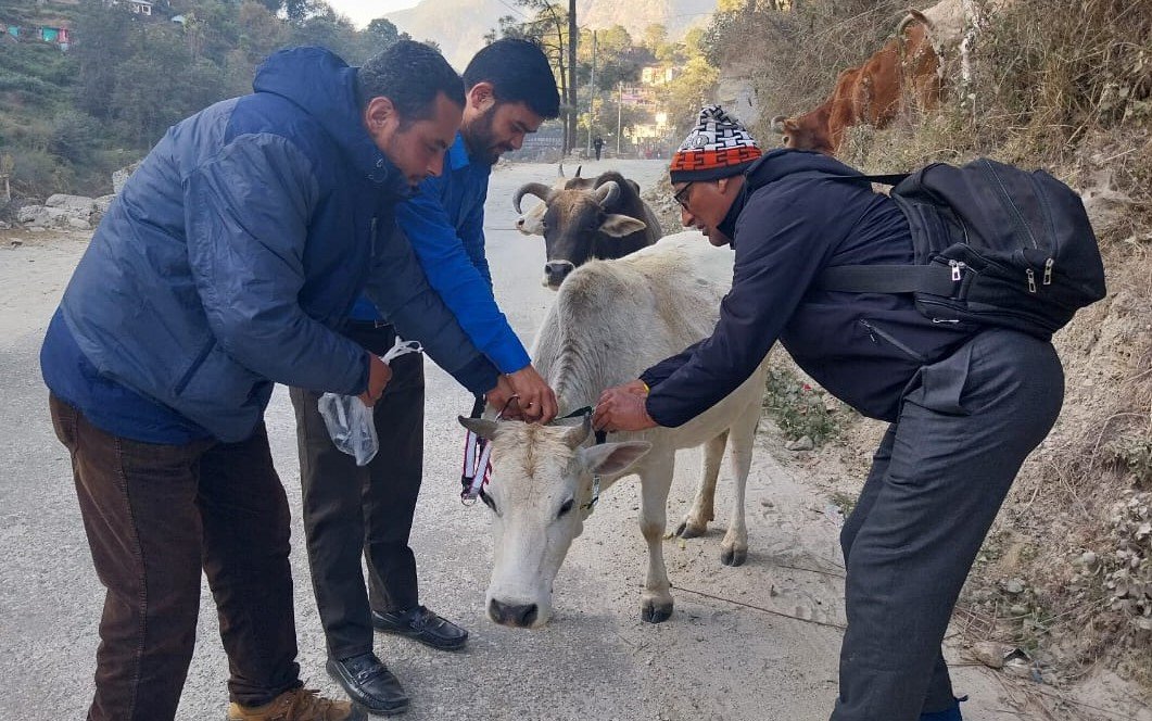 थराली (चमोली)। चमोली जिले के थराली नगर पंचायत क्षेत्र में आवारा घूम रहे पशुओं पर नगर पंचायत एवं जागो हिमालय संस्था के सहयोग से रिफ्लेक्टिव कालर लगाए गए हैं, जिससे कि पशुओं को रात्रि में वाहनों से होने वाली दुर्घटनाओं से बचाया जा सके।
