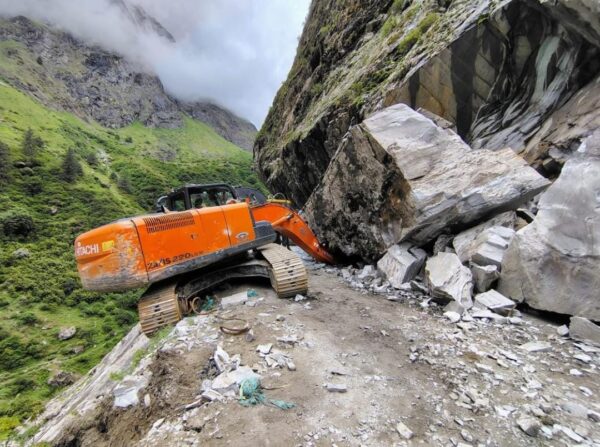 चमोली : बद्रीनाथ राष्ट्रीय राजमार्ग पर हनुमान चट्टी के पास घुडसिल में एक एक्सावेटर मशीन के ऊपर पहाड़ी से भारी बोल्डर गिरने से मार्ग अवरुद्ध हो गया। जोशीमठ तहसील प्रशासन की ओर से यहां दोनों ओर फंसे तीर्थयात्रियों को पानी, बिस्कुट, नमकीन, शीतल पेय और जरूरी राहत सामग्री बांटने के साथ मार्ग को सुचारू किया जा रहा है। यहां पर वोल्डर से दबी एक्सावेटर मशीन को निकालने और सड़क से वोल्डर हटाने का काम जारी है। जल्द ही मार्ग को यातायात के लिए सुचारू कर लिया जाएगा।