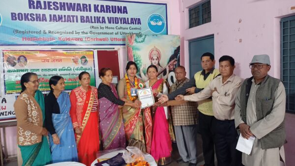 कोटद्वार : अन्तरराष्ट्रीय महिला दिवस 08 मार्च के उपलक्ष में कण्वाश्रम मार्ग में बोक्सा जनजाति स्कूल मे स्वराज समिति के तत्वाधान में एक कार्यक्रम आयोजित किया गया. सर्वप्रथम दीप प्रज्वलित कर सर्व धर्म प्रार्थना एवं गांधी जी के प्रिय भजन गाए गए. कार्यक्रम में अन्तरराष्ट्रीय महिला दिवस के अवसर पर वरिष्ठ समाजसेवी एवं प्रदेश महामंत्री महिला कांग्रेस गीता सिंह को डॉक्टर अंबेडकर फेलोशिप नेशनल अवार्ड से सम्मानित किया गया. यह अवार्ड उन्हें  भारतीय दलित साहित्य अकादमी के द्वारा दिया गया.