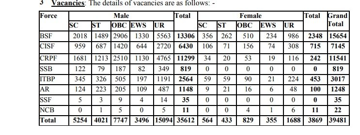 SSC GD कांस्टेबल भर्ती 2025 के तहत कुल 39,481 पदों पर भर्ती के लिए नोटिफिकेशन जारी किया है। इसमे से 35,612 पदों पर युवाओं और 3,869 पदों पर युवतियों की भर्ती की जाएगी। इसके लिए कमसे कम उम्र 18 साल और अधिकतम उम्र 23 साल होनी चाहिए।