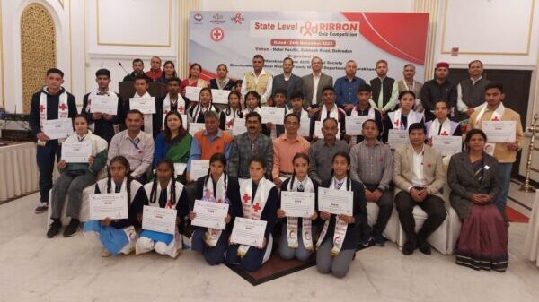 देहरादून : उत्तराखण्ड राज्य एड्स नियंतरण समिति एवं भारतीय रेड क्रॉस सोसाइटी उत्तराखण्ड के संयुक्त तत्वाधान में एचआईवी / एड्स के नियंत्रण एवं जागरूकता विषय पर राज्य स्तरीय क्विज़ प्रतियोगिता का आयोजन होटल पैसेफिक देहरादून में किया गया, उक्त राज्य स्तरीय क्विज़ प्रतियोगिता मे उत्तराखण्ड के विभिन्न जनपदों के विद्यालयों में से छात्र–छात्राओं द्वारा प्रतिभाग किया गया, उक्त राज्य स्तरीय क्विज़ प्रतियोगिता के मुख्य अतिथि कर्नल अलोक गुप्ता (एसएचओ) थे । उक्त राज्य स्तरीय क्विज़ प्रतियोगिता में एचआईवी/एड्स, एसटीआई, टीबी एवं अन्य स्वास्थ्य विषय पर आधारित प्रश्नोत्तर छात्र – छात्राओं से पूछे गए ।