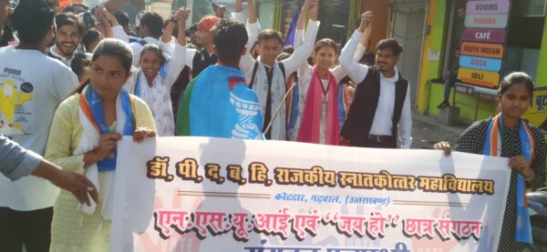 कोटद्वार । राजकीय स्नाकोत्तर महाविद्यालय कोटद्वार के छात्र संगठनों ने शनिवार को शक्ति प्रदर्शन कर अपने-अपने प्रत्याशियों के हित में मतदान करने की अपील की । शनिवार को छात्र संघ प्रत्याशीयों ने नामांकन दाखिल कर जुलूस निकाला । एनएसयूआई ओर जय हो संगठन ने मिलकर अपने प्रत्याशियों के लिए शक्ति प्रदर्शन किया । एनएसयूआई और जय हो संगठन के सभी कार्यकर्ता व समर्थक मालवीय उघान में एकत्रित हुए । जहां से वह ढोल की धुन पर जमकर शक्ति प्रदर्शन करते महाविद्यालय पहुंचे और अपने प्रत्याशियों के साथ महाविद्यालय के अंदर उनके लिए मतदान करने की अपील की । वहीं वन्दे मातरम संगठन के कार्यकर्ता पटेल मार्ग स्थित एक बारात घर में एकत्रित हुए। जहां से सभी कार्यकर्ता संगठन के प्रत्याशीयों के समर्थन में नगर में जुलूस निकालकर शक्ति प्रदर्शन करते हुए नजर आए । अंत मैं संगठन के कार्यकर्ता भी महाविद्यालय में पहुंचे और अपने प्रत्याशियों के हित में समर्थन मांगते हुए देखे इस मौके पर प्रशासन व पुलिस प्रशासन भी मुस्तैद दिखा ।