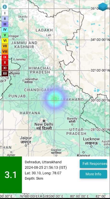 देहरादूनः उत्तराखंड में एक बार फिर भूकंप के झटके महसूस किए गए। रविवार की रात करीब 9:56 मिनट पर देहरादून में भूकंप के झटके महसूस किए गए हैं। रिक्टर स्केल पर भूकंप की तीव्रता 3.1 मापी गई है। भूकंप का केंद्र अक्षांश 30.10 उत्तर और देशांतर 78.07 पूर्व में देहरादून की 5 किलोमीटर की गहराई पर स्थित था। लोगों को भूकंप के झटके महसूस होते ही हड़कंप मच गया। लोग घबराकर अपने घरों से बाहर निकल आए। हालांकि, अभी तक भूकंप से किसी तरह के कोई नुकसान की सूचना नहीं मिली है। देहरादून भूकंप के सबसे ख़तरनाक जोन 5 में आता है।