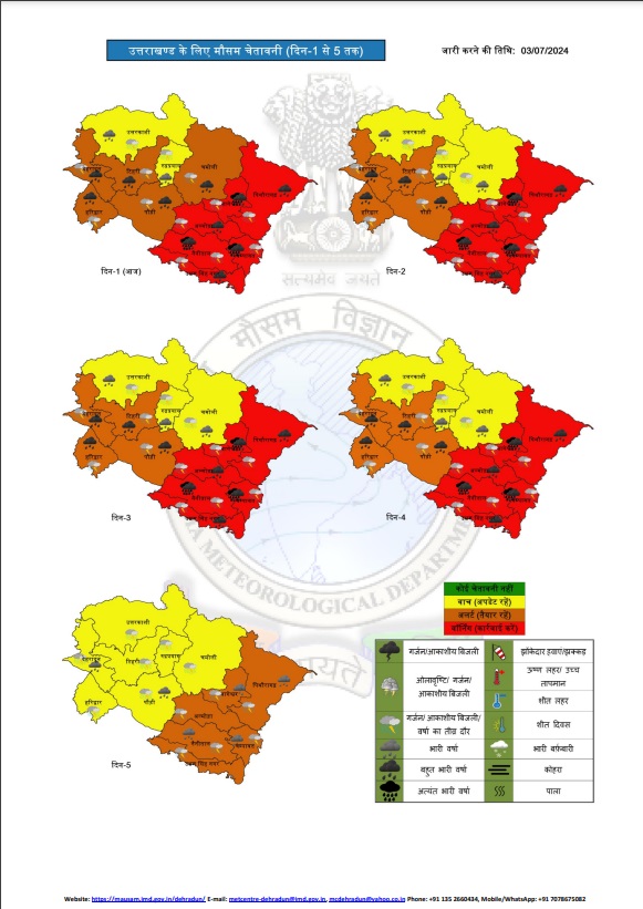 देहरादून : मौसम विभाग ने आज से सात जुलाई तक का मौसम पूर्वानुमान जारी किया है। मौसम विभाग के अलर्ट के अनुसार प्रदेशभर में भारी बारिया का दौर जारी रहेगा। इस दौरानों को भारी दिक्कतों का सामना भी करना पड़ सकता है। पहली बारिश में ही प्रदेशभर में कई सड़कें और संपर्क मार्ग बंद हो गए हैं। गंगोत्री, यमुनोत्री और बद्रीनाथ मार्ग लगातार रुक-रुक कर बंद हो रहे हैं, जिसके चलते यात्रियों को दिक्कतों का सामना करना पड़ रहा है।