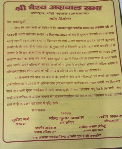 कोटद्वार। श्री वैश्य अग्रवाल सभा का दो दिवसीय जयंती समारोह 16 दिसंबर से आयोजित किया जायेगा। श्री वैश्य अग्रवाल सभा के मिडिया प्रभारी राजीव गोयल ने बताया कि प्रथम दिवस पर शहर में अग्र चेतना बाइक रैली के साथ ही शोभायात्रा भी निकाली जायेगी। द्वितीय दिवस पर मुक्तिधाम स्थित शनि मंदिर में वृक्षारोपण के बाद बच्चों के लिए विभिन्न प्रतियोगिताओं का आयोजन किया जायेगा।
