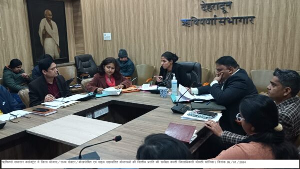 देहरादून : जिलाधिकारी सोनिका की अध्यक्षता में ऋषिपर्णा सभागार कलेक्ट्रेट में जिला योजना/राज्य सेक्टर/केन्द्रपोषित एवं वाह्य सहायतित योजनाओं की वित्तीय प्रगति की समीक्षा की गई। जिलाधिकारी ने सभी विभागों के अधिकारियों केा निर्देशित किया कि जिला योजना में माह जनवरी तक प्रगति शत्प्रतिशत करें। जिलाधिकारी ने सभी विभागोंक के अधिकारियों को निर्देशित किया कि परिसम्पतियों की जीआईएस टैगिंग कार्यों को तीन दिन करते हुए रिपोर्ट प्रस्तुत करें रिपोर्ट प्रस्तुत न करने वाले वाले विभागों के अधिकारियों का स्पष्टीकरण तलब करने के निर्देश दिए। साथ ही परिसम्पतियों के जीओ टैगिंग कार्यों की प्रतिदिन रिपोर्ट प्र्रस्तुत करने के निर्देश दिए। साथ ही जिला अर्थ एवं संख्या अधिकारी को ईको टूरिज्म अर्न्तगत कराए जा रहे कार्यों का निरीक्षण करने के निर्देश दिए।