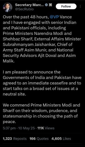 वहीं, अमेरिकी विदेश सचिव मार्को रुबियो ने बताया कि पिछले 48 घंटों में भारत के प्रधानमंत्री नरेंद्र मोदी, पाकिस्तान के प्रधानमंत्री शहबाज़ शरीफ, विदेश मंत्री एस. जयशंकर, पाकिस्तान सेना प्रमुख जनरल असीम मुनीर और राष्ट्रीय सुरक्षा सलाहकार अजीत डोभाल व असीम मलिक से निरंतर संवाद हुआ।
