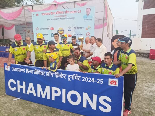 देहरादून : उत्तराखंड में स्वास्थ्य जागरूकता को बढ़ावा देने के उद्देश्य से आयोजित “उत्तराखंड हेल्थ प्रीमियर लीग” क्रिकेट टूर्नामेंट का समापन भव्यता से हुआ। इस अनोखे टूर्नामेंट का मुख्य उद्देश्य स्वस्थ जीवनशैली को बढ़ावा देना और विभिन्न स्वास्थ्य मुद्दों के प्रति जागरूकता फैलाना था। इस टूर्नामेंट के प्रथम संस्करण का विजेता रहा उत्तराखंड पावर कॉर्पोरेशन लिमिटेड (यूपीसीएल), जिन्होंने “थोड़ा कम, तेल, चीनी और नमक” थीम पर आधारित मैच खेला। यूपीसीएल ने अपने उत्कृष्ट प्रदर्शन से सीएमओ किंग्स 11 को 28 रनों से हराया, जो “शिशु स्वास्थ्य- ओ.आर.एस. का घोल पिलाओ, डायरिया को दूर भगाओ” थीम के अंतर्गत मैच खेल रहे थे। यूपीसीएल ने टॉस जीतकर पहले बल्लेबाजी करते हुए बीस ओवर में 7 विकेट के नुकसान में 172 रन बनाए। जवाब में सीएमओ किंग्स 11 की टीम ने निर्धारित बीस ओवर में 144 रन ही बना पाए। फाइनल मुकाबले में संजय जोशी ने 5 विकेट लिए, जिसके लिए उन्हें मैन ऑफ द मैच से नवाजा गया।
