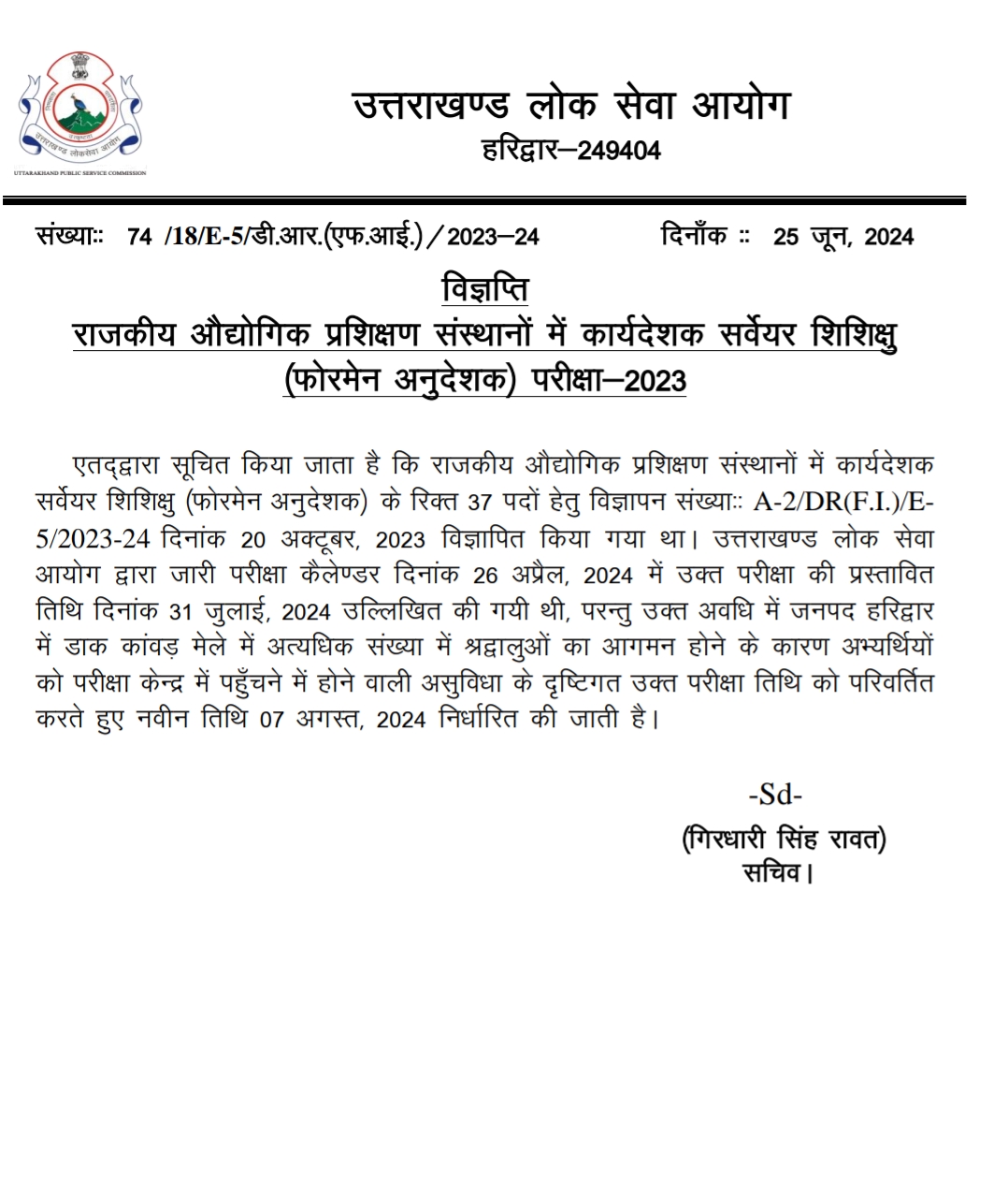 उत्तराखण्ड लोक सेवा आयोग (UKPSC) द्वारा जारी परीक्षा कैलेण्डर दिनांक 26 अप्रैल, 2024 में उक्त परीक्षा की प्रस्तावित तिथि दिनांक 31 जुलाई, 2024 उल्लिखित की गयी थी। उक्त अवधि में जनपद हरिद्वार में डाक कांवड़ मेले में अत्यधिक संख्या में श्रद्वालुओं का आगमन होने के कारण अभ्यर्थियों को परीक्षा केन्द्र में पहुँचने में होने वाली असुविधा के दृष्टिगत उक्त परीक्षा तिथि को परिवर्तित करते हुए नवीन तिथि 07 अगस्त, 2024 निर्धारित की जाती है।