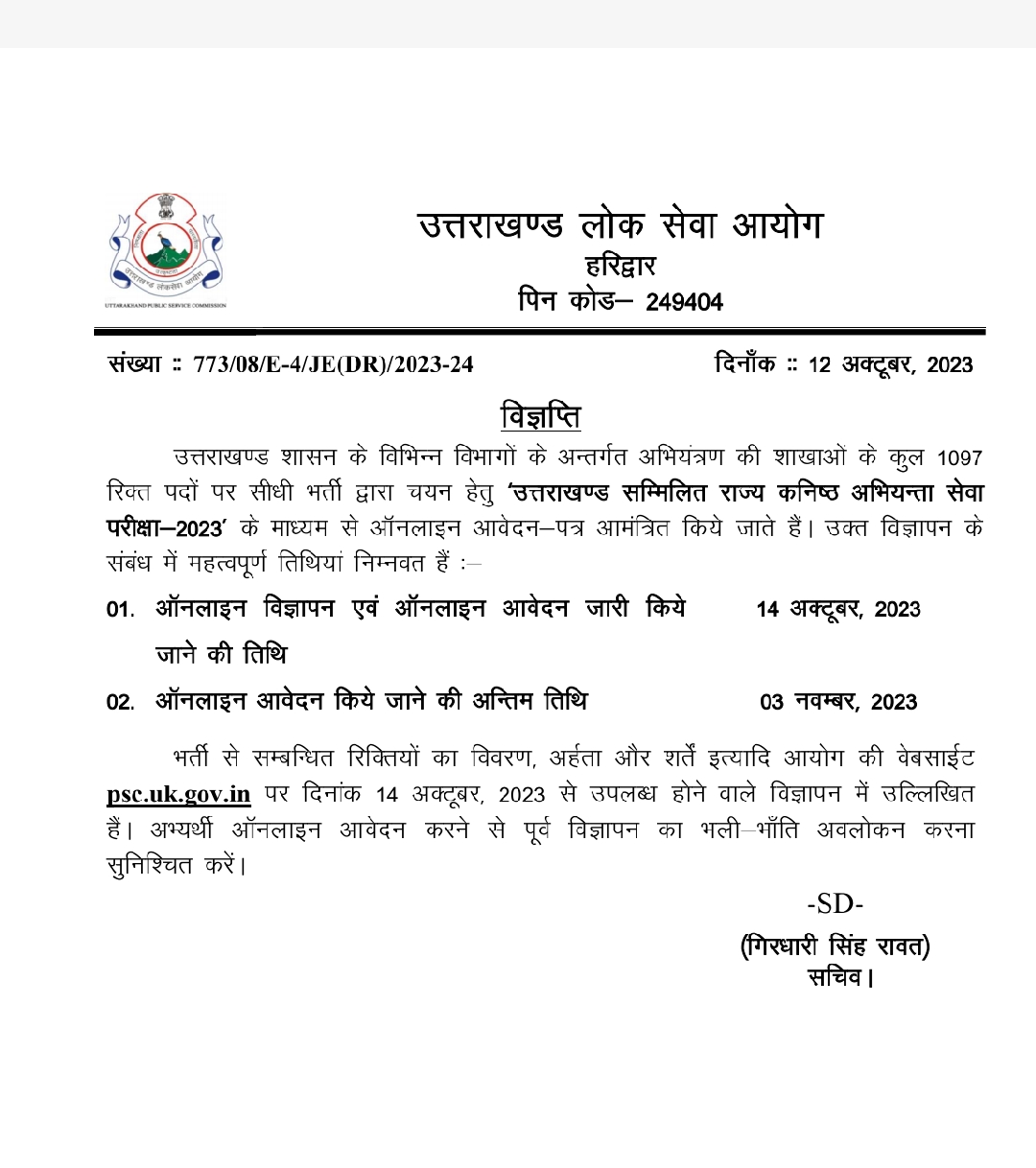 देहरादून : उत्तराखंड में बेरोजगारों के लिए अच्छी खबर है कि धामी सरकार एक के बाद एक भर्ती की विज्ञप्तियां जारी कर रही है आज 12 अक्टूबर को लोक सेवा आयोग द्वारा 1097 पदों पर सीधी भर्ती जारी की गई है।