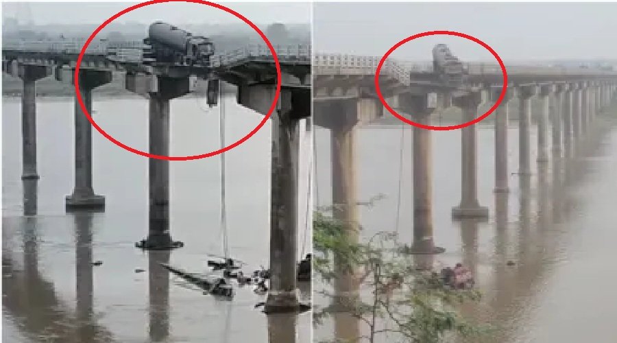 पुलिस निरीक्षक विजय चरण ने जानकारी दी कि अब तक चार लोगों को सुरक्षित निकाल लिया गया है और रेस्क्यू ऑपरेशन जारी है। वहीं, घटनास्थल से प्राप्त वीडियो में देखा जा सकता है कि पुल का एक भाग पूरी तरह ध्वस्त हो चुका है। एक टैंकर पुल के ढहे हुए हिस्से में अटका दिखाई दे रहा है, जबकि एक बाइक हवा में लटकी हुई नजर आ रही है।
