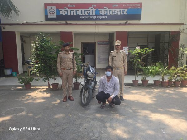 कोटद्वार । कोतवाली कोटद्वार पुलिस ने चोरी की मोटर साइकिल सहित शातिर चोर को गिरफ्तार करने में सफलता प्राप्त की है। आरोपी पूर्व में भी चोरी की घटनाओं में जेल जा चुका है। कोतवाली से प्राप्त जानकारी के अनुसार विगत 27 अप्रैल को आजिम, निवासी- लकड़ी पड़ाव द्वारा कोतवाली में उनकी बजाज डिस्कवर मोटर साइकिल को किसी अज्ञात द्वारा चोरी करने की रिपोर्ट दर्ज कराई गई। इस पर मुकदमा दर्ज करते हुए कोतवाली पुलिस ने खोजबीन आरंभ कर दी। इस क्रम में प्रभारी निरीक्षक के नेतृत्व में गठित पुलिस टीम ने अथक प्रयास करने के बाद शुक्रवार रात को चैकिंग के दौरान अजय पुत्र धर्म सिंह, निवासी- कौड़िया कैम्प, कोटद्वार को रेलवे स्टेशन के पीछे पुराने डाकघर के पास से चोरी की गई मोटरसाइकिल के साथ गिरफ्तार करने में सफलता प्राप्त की। आरोपी को न्यायालय के समक्ष पेश किया जा रहा है ।