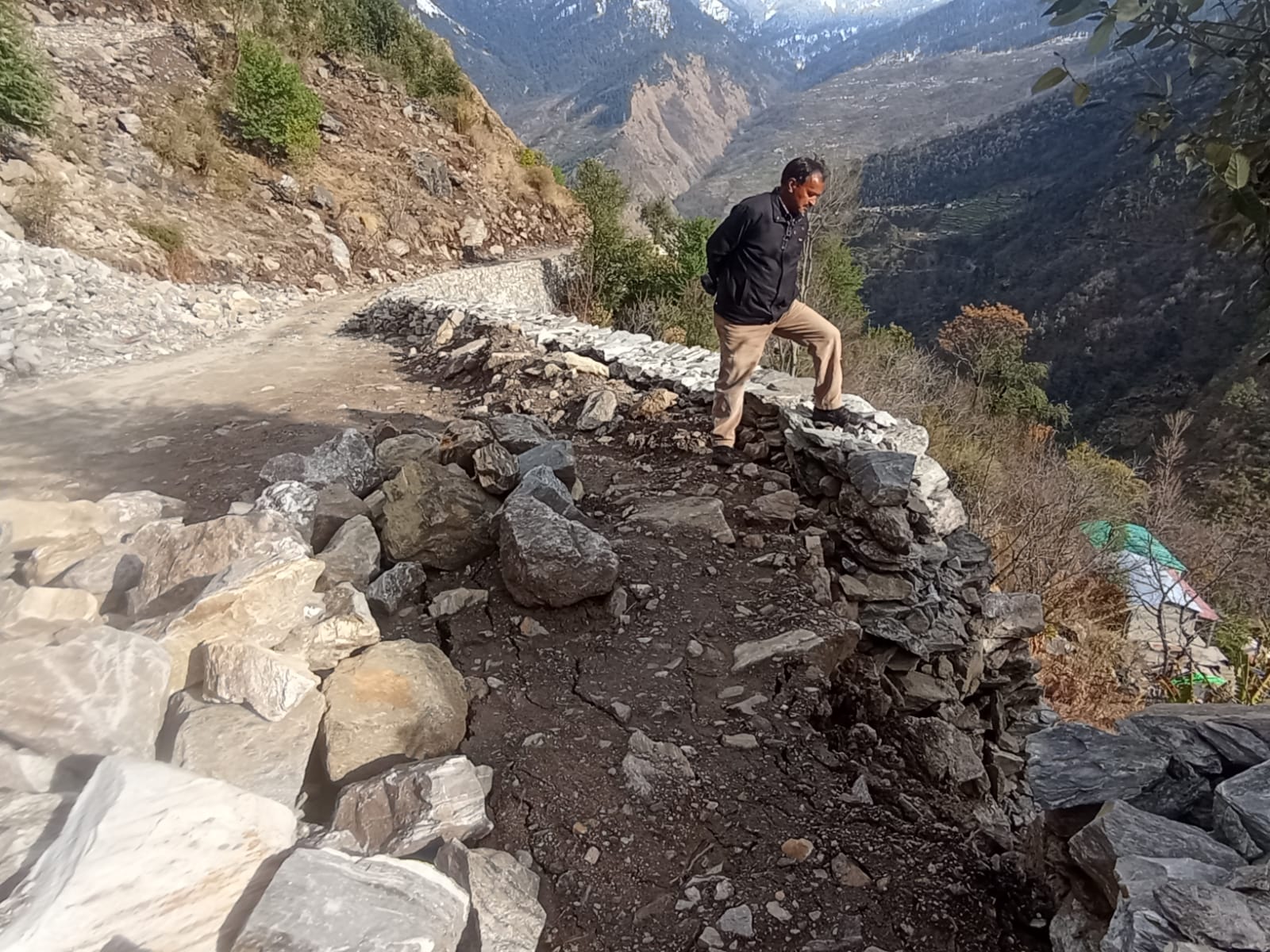गोपेश्वर (चमोली)। चमोली जिले के जोशीमठ विकास खंड के उर्गम घाटी के ग्रामीणों ने आरोप लगाया है कि भेंटा-भर्की मोटर मार्ग जिसका निर्माण पीएमजीएसवाई के माध्यम से किया जा रहा है। जाडे़ के मौसम की बरसात में ही धराशाही हो गई है। क्षेत्र के नंदा सिंह नेगी, ग्राम प्रधान हेमलता देवी, सामाजिक कार्यकर्ता लक्ष्मण सिंह नेगी ने आरोप लगाते हुए कहा कि भेटा-भर्की मोटर मार्ग पर घटिया निर्माण को लेकर कई बार शासन-प्रशासन से शिकायत की जा चुकी है लेकिन उनकी एक बार भी नहीं सुनी गई और नतीजा यह है कि जाड़े के मौसम में बीते दो दिनों हुई बारिश के चलते सड़क की दीवारे कई स्थानों पर क्षतिग्रस्त हो गई है। सड़के के पुस्ते ढह जाने के कारण ग्रामीणों की ओर से किये गये सामुहिक वनीकरण के 280 से भी अधिक बांज, देवदार के पेड़ों का नुकसान पहुंच रहा है।