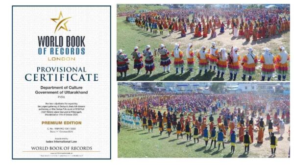 देहरादून : प्रधानमंत्री नरेन्द्र मोदी के 12 अक्टूबर को देवभूमि उत्तराखण्ड आगमन पर उत्तराखण्ड के छोलिया और झौडा लोक नृतकों की ढोल दमाऊँ लोक वाद्यों के साथ प्रस्तुति को वर्ल्ड बुक ऑफ रिकार्ड में स्थान प्राप्त हुआ है। यह जानकारी देते हुये निदेशक संस्कृति विभाग द्वारा बताया गया है कि सीमान्त जनपद पिथौरागढ़ में समुद्र तल से 5338 फीट (1627) मीटर की आश्चर्यजनक ऊँचाई पर एक अनोखा और ऐतिहासिक कार्यक्रम संस्कृति विभाग, उत्तराखण्ड द्वारा आयोजित किया गया। उत्तराखण्ड के इतिहास में पहला कार्यक्रम था जिसमें जनपद पिथौरागढ़ के सुदूरवर्ती अंचलों से छोलिया एवं झौड़ा नृत्यक दल के लगभग 3000 लोक कलाकारों द्वारा अपनी पारम्परिक वेश-भूषा एवं लोक गीतों के माध्यम से विश्व का ध्यान उत्तराखण्ड की ऐतिहासिक एवं समृद्धशाली लोक सांस्कृतिक विरासत की ओर आकर्षित किया हिमालय के हृदय सीमान्त जनपद पिथौरागढ़ में एक असाधारण एवं अभूतपूर्व घटना दुनिया को देखने को मिली।