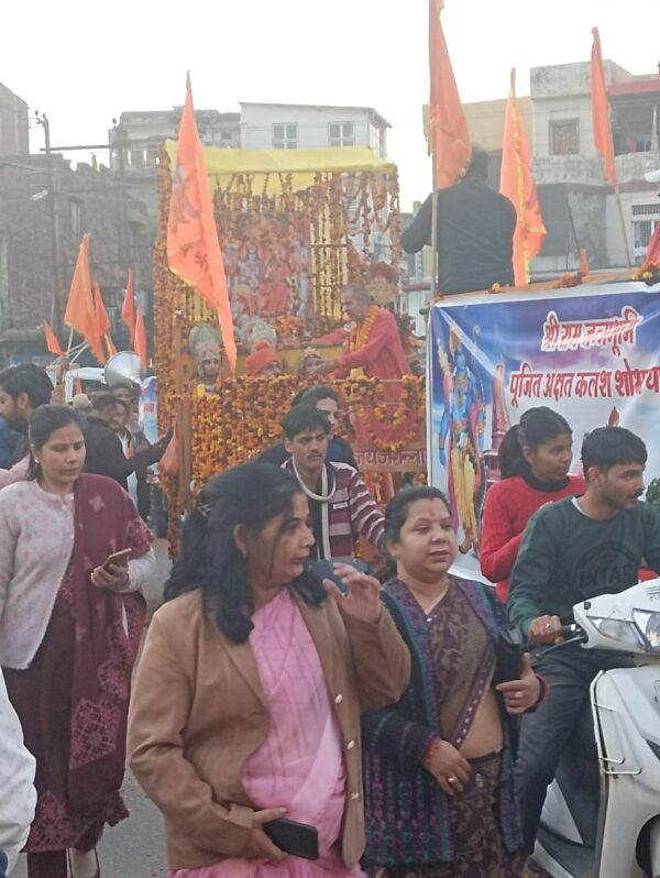 कोटद्वार । अयोध्या में 22 जनवरी को श्रीरामलला की प्राण प्रतिष्ठा होने वाली है। भव्य मंदिर बनकर तैयार हो रहा है। इस पावन अवसर पर होने वाली खुशी अब पौड़ी गढ़वाल के कोटद्वार में दिखने लगी है। शुक्रवार को प्राण प्रतिष्ठा कार्यक्रम की जनजागरूकता के लिए आयोजित अक्षत कलश यात्रा में यह उत्साह नजर आया। शहर से बड़ी संख्या में लोगों ने इस आयोजन में भाग लिया। यात्रा कोटद्वार के प्रवेश द्वार कौड़ियां से विधानसभा अध्यक्ष ऋतु खंडूरी के नेतृत्व में निकाली गई। जोकि नजीबाबाद रोड़, लालबत्ती चौक, बद्रीनाथ मार्ग, झंडाचौक से होते हुए मालवीय उद्यान में संपन्न हुई। राष्ट्रीय स्वयंसेवक संघ के पदाधिकारीगण, विहिप के पदाधिकारीगण के साथ बीजेपी के लोग एकत्र हुए। इसमें बड़ी संख्या में महिलाएं भी थीं।